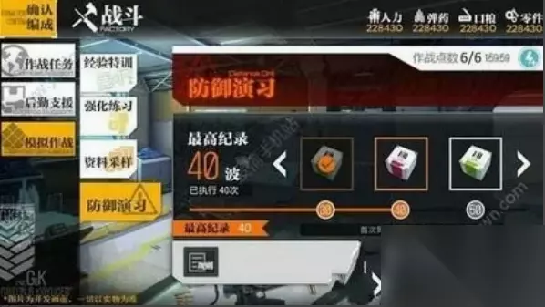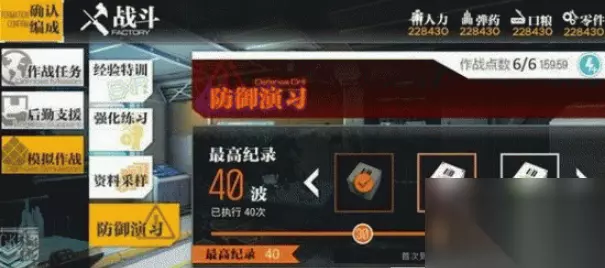 3、防御演习是一种无限模式,拥有无限波敌人,没有战场地图,直接开始战斗。 4、玩家需要消耗5点作战点才能进入防御演习。需要 准备4对演习梯队,并且玩家只能使用四队梯队。玩家战胜的敌人越多奖励会越丰厚。