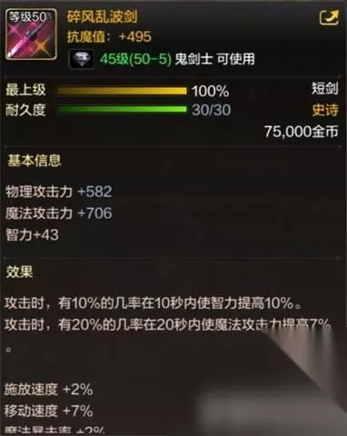 dnf手游碎风乱波剑怎么样: 一、基本信息 抗魔值: +495 物理攻击力+582 魔法攻击力+706 智力+43 二、基本效果 攻击时,有10%的几率在10秒内使智力提高10%。 攻击时,有20%的几率在20秒内使魔法攻击力提高7% 施放速度+2% 移动速度+7% 魔法暴击率+2% 命中+195 三、特殊效果 鬼剑士,地裂.波动剑Lv +3 四、获取方法: dnf手游碎风乱波剑获取方法