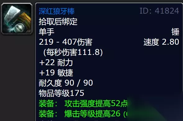 3、该武器有着219-407点的伤害,还有着22点的耐力和19点的敏捷。 4、装备到角色身上可以提升52点的攻击强度,爆击等级提升26点。