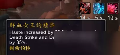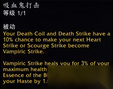 效果翻译(仅鲜血专精部分): 你的凋零缠绕或灵界打击有10%概率令下一次心脏打击变为吸血鬼打击。 吸血鬼打击为你恢复3%的最大生命值并获得鲜血女王的精华,每层提升1.5%急速(至多5层)持续20秒。 与心脏打击对比