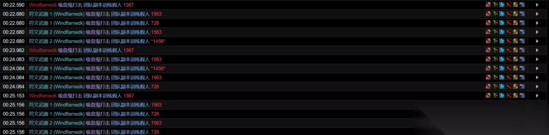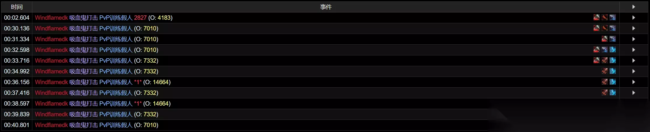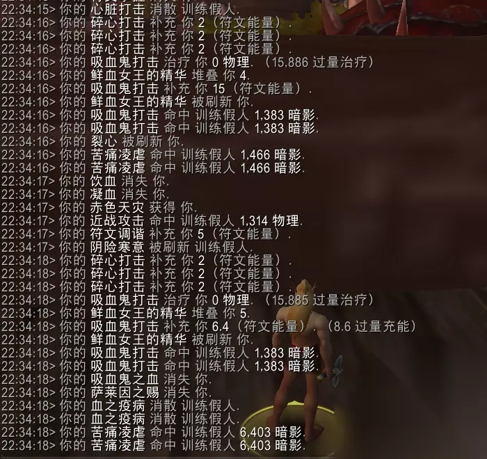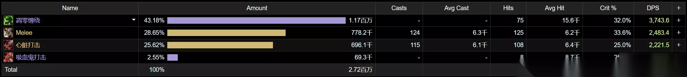 对于DKT来说,灵界打击触发该特效不存在疑问。 这里专门进行凋零缠绕的触发测试,可见75次凋零缠绕实际触发8次吸血鬼打击,结果符合10%触发率。