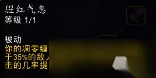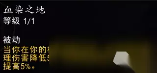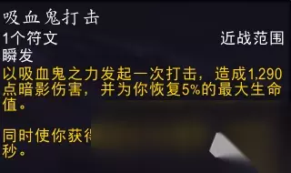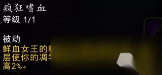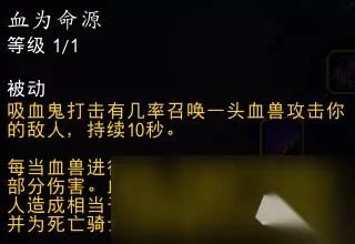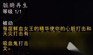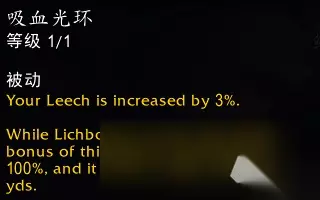 效果翻译(仅鲜血专精部分): 你的吸血提升3%。 当巫妖之躯激活时,这一吸血效果提升100%,并影响周围12码内的4个盟友。 无需处于小队或团队中