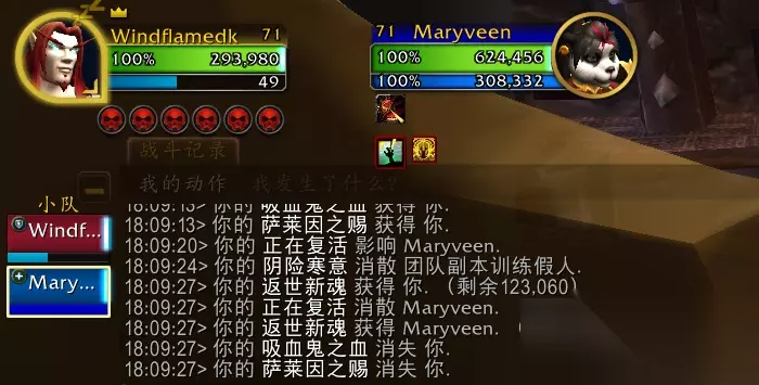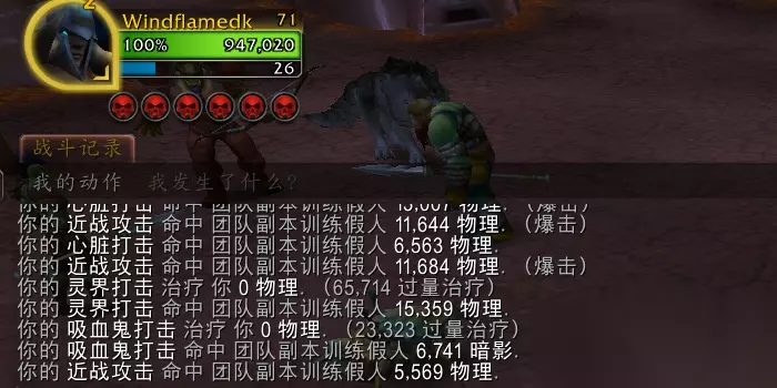 另外两个可能的干扰项:全能提高2.62%治疗量、测试服光环减少20%治疗量。 进行计算:((23323/1.0262)/0.8)/947020=3.0% 可知非萨莱茵之赐期间吸血鬼打击确实恢复最大血量3%,且吃全能加成,后续测试可知还能暴击。
