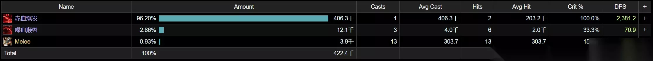 通过战斗记录可知该血兽平砍和喋血顺劈实际造成的总伤害约为16000点。 79361正好是16000的5倍左右,由此可知目前该天赋存在bug,并不是存储伤害的50%,而是存储伤害的500%(5倍)。