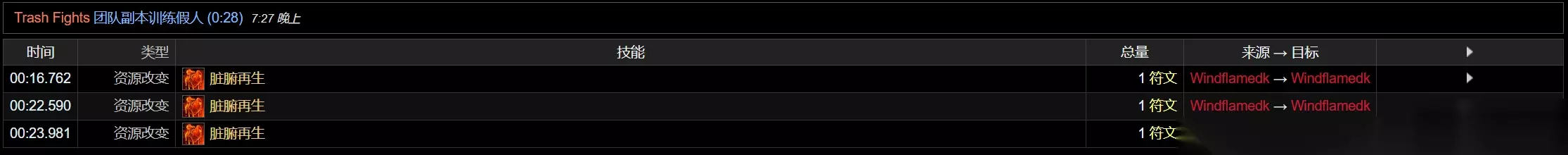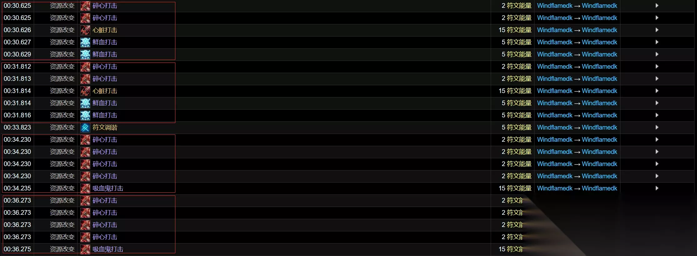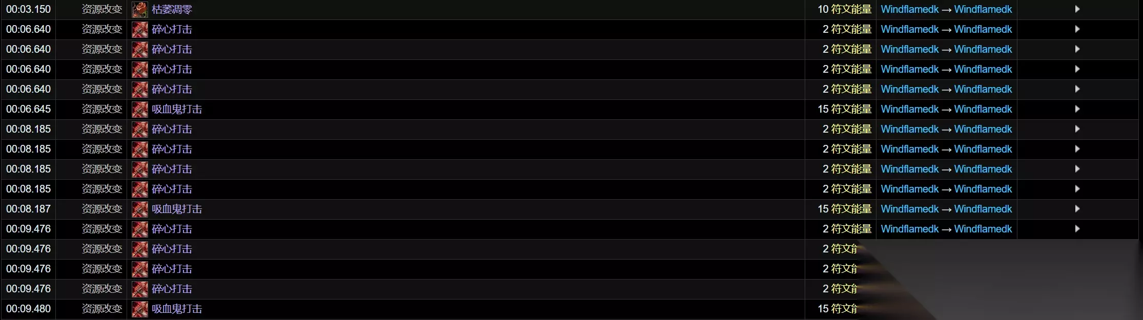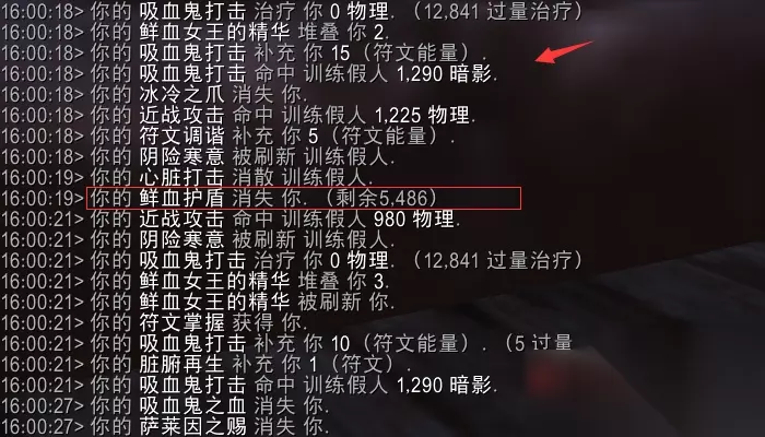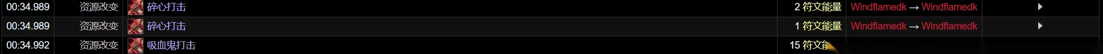 在2级碎心打击天赋不变的前提下,开启符文刃舞,对2目标进行输出。 可以看到前两次心脏打击可以正常获取鲜血打击的符能,但是转化到吸血鬼打击后就不再能够获取鲜血打击的符能了。 因此当前版本不改的话,点出碎心打击的前提下从最大化符能获取角度出发符文刃舞需要和吸血鬼之血错开开。 与强化心脏打击的交互