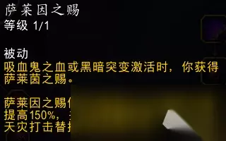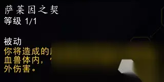 心脏打击延长的机制不存在疑点,这里重点测试吸血鬼打击延长的机制。 多次测试后确认,该天赋目前是生效的,就是生效的方式...非常具有批判性。 吸血鬼打击每次施放都会重置鲜血女王的精华到20秒,在该buff下会重置后额外延长1秒。 但后续再打吸血鬼打击,依然会先重置、再延长1秒。 也就是说该天赋实际上是让吸血鬼打击把buff重置到20秒变为重置到21秒。 4-3-A.萨莱茵之契 − 萨莱茵之契 ... 天赋说明