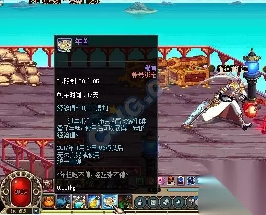 这活动在外服属于新号福利,给1级小号吃一个,瞬间18级,特爽。国服被和谐了也没办法。 可以看出,国服30级可以使用,经验突变等级为40级,50级,60级,67级,85级。 接下来是验证: 楼主早在数天前就有验证这个结论的计划。所以我这个预约小号一直停留在65级。 1)65级时,经验值增加80万。