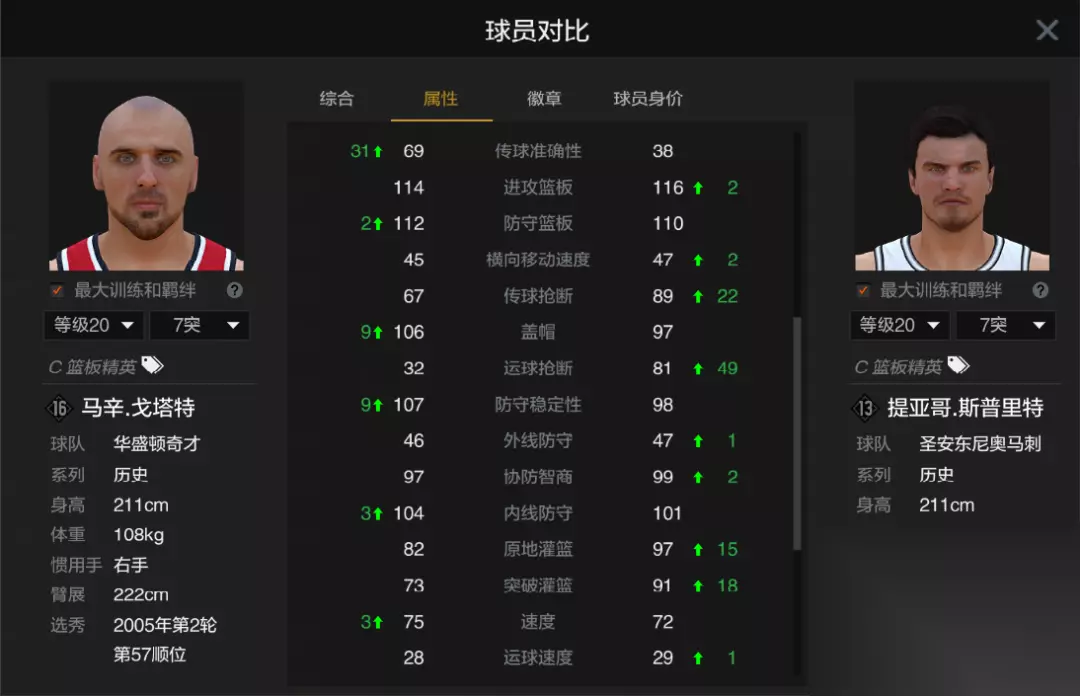 点击打开原图查看保存 这样一看,模型宽度方面,奥尼尔和钱德勒顶级,这也是他们挡拆质量好的原因;臂展方面,大帅、白边、亚当斯、瓦兰、庄神都是同身高下的顶级,实际篮板表现也确实强 而戈塔特和斯普利特这对复制人兄弟的模型就不够突出了,都是211CM内线的标准宽度和臂展,110+的篮板和力量相比同身高的卡皇级内线历史亚当斯、莫宁、庄神都要弱差不多10点左右,加上速度只算合格,实际篮板表现确实也要差一些 经理模式的篮板动画重要性由高到低分别为:补扣动画>补篮动画>卡位动画>直升机篮板等冲板动画 戈塔特大部分情况下都是卡位抢板,靠银卡位徽章能触发不少反卡动画,站板比较稳,只要不是对位大模型陈列室都有一战之力,并且抢板后不上头强起,能够传回外线重打,非常听话,69的传球准确性也保证传球速度合格 戈塔特偶尔会靠空中作业触发补扣动画,频率远低于同届的历史庄神,而且因为戈塔特扣篮数值太低,比斯普里特都低接近20点,实战比较难扣进 另外戈塔特虽然具备直升机篮板动画,但直升机篮板动画的价值在经理模式基本是智商税,就算奥尼尔这种陈列室打上几局经理也难见触发一次。如果直升机篮板动画真那么有用,那马威、现役霍华德等人也不会让白边这种无直升机篮板动画的大模型内线给压一头了,还不如加点模型或者速度来得实在 补篮得手 反卡对方戈塔特后传队友空位 两次起跳都没拿到篮板,被对方戈塔特站板助攻外线 和庄神肉搏卡位保板 戈塔特的掩护质量和历史斯普里特基本一致,靠银铜墙铁壁经常能挂出夸张的挡拆动画,虽然力量要弱于历史亚当斯、庄神等人,但在能挂到人的情况下,也是211CM模型下比较优秀的挡拆水平,没办法和陈列室等大模型内线比,但也够用了,挂大模型外线或没挡拆躲闪者徽章球员是没太大问题的 不过戈塔特因为动作速率比较慢,实战有时会出现挡拆不到位/不及时的情况,直接导致自己优秀的挡拆质量无法完全发挥,在目前各种90+速度三体人内线面前有点被降维打击了,后面的挡拆动图也能很客观地展现出这个问题 因此综合挡拆到位率这一方面,戈塔特的实际挡拆能力就要比亚当斯、庄神这种高速同模型内线和唐纳森等大模型内线略差一些了