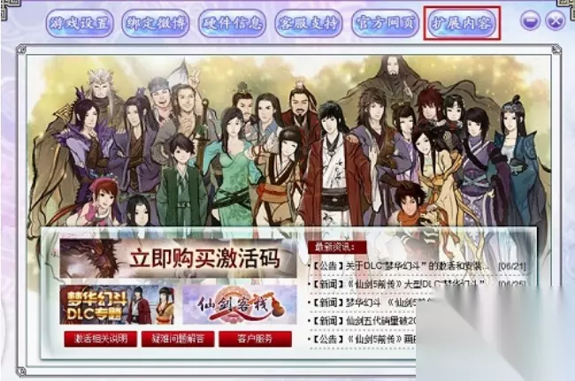 激活dlc步骤介绍: 1、要体验"梦华幻斗"的精彩内容,需要首先激活DLC。 2、点击《仙剑5前传》客户端右上方“扩展内容”按钮。