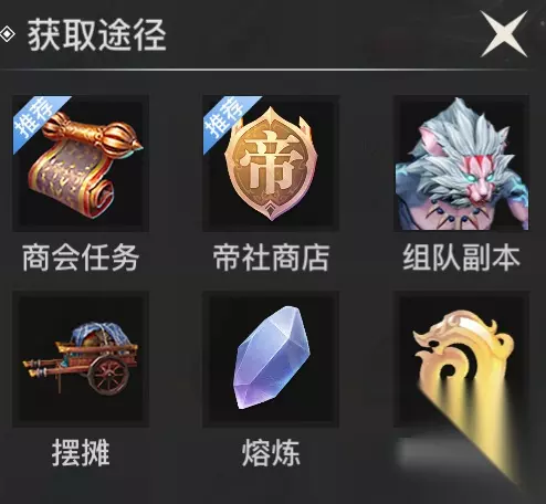 材料获取途径: 1.蕴魂晶石 (1)商会任务,数量随机,初等宝箱15个; (2)普通副本,数量随机,3次均有; (3)帝社商店:每周可购买1折蕴魂晶石100个,每个8帝社积分,共计800帝社积分;2折蕴魂晶石300个,15帝社积分,共计4500帝社积分;两个共计一周5300帝社积分,建议优先购买1折,兑换完玉龙角后可优先兑换2折蕴魂晶石。(高等级后帝社变为蕴魂晶石 白虎) (4)商城蕴魂晶石袋,5折,每周可购买50个,每个50天玉,共计2500天玉;蕴魂晶石袋(无折扣),每个价值100天玉,每周可购买500个,建议小资和大佬玩家可考虑按需购买。 2.蕴魂晶石·白虎: