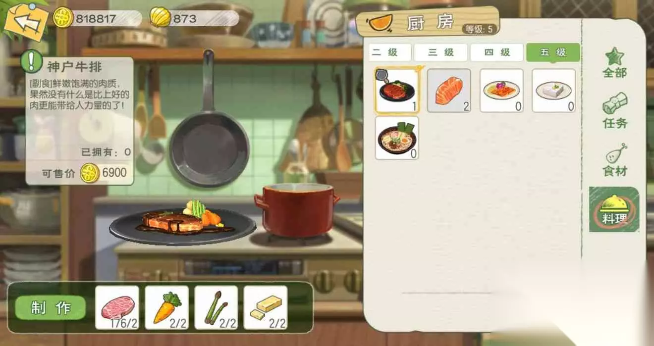 神户牛排:食用可恢复50点体力,20%概率在劳作时降低1点体力消耗(持续30分钟);