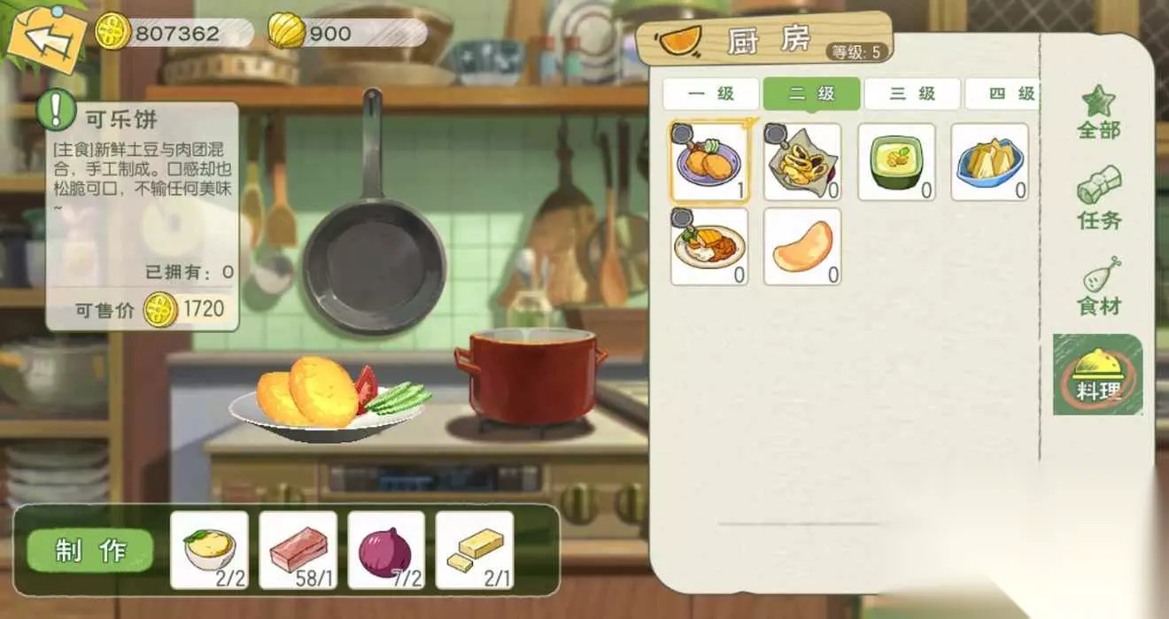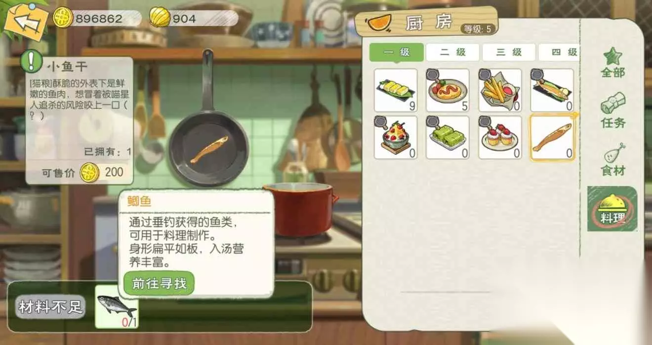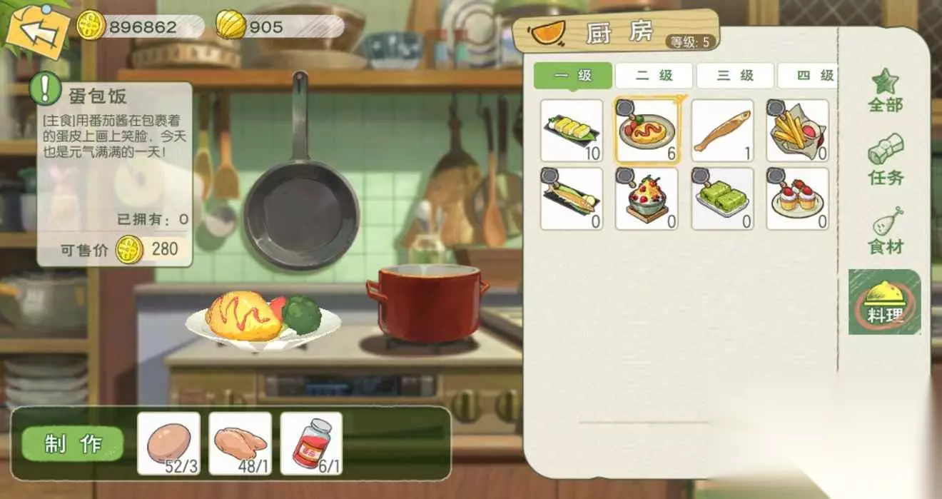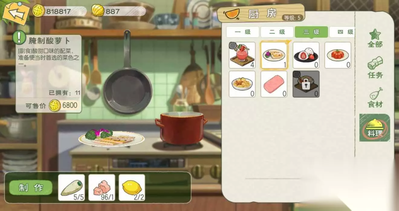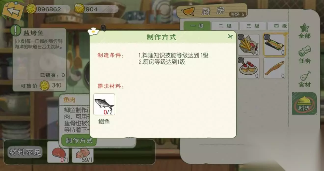 t15_2-t15_1:6.0 标签: 厨房 我们在游戏中可以化身厨神小当家,亲手制作各种美味的料理,而不同等级的料理也是需要相应等级的厨房才可以制作,这里就给大家带来了小森生活料理大全,各级厨房菜谱的制作配方以及料理效果介绍。 【1级厨房】 薯条:食用可恢复40点体力,移速提升10%(持续10分钟);