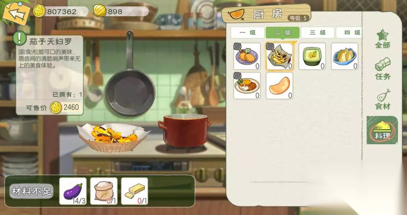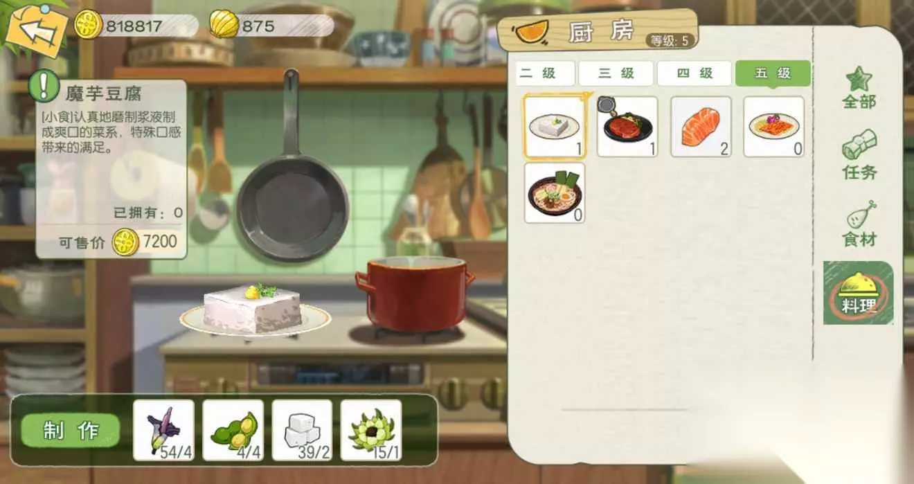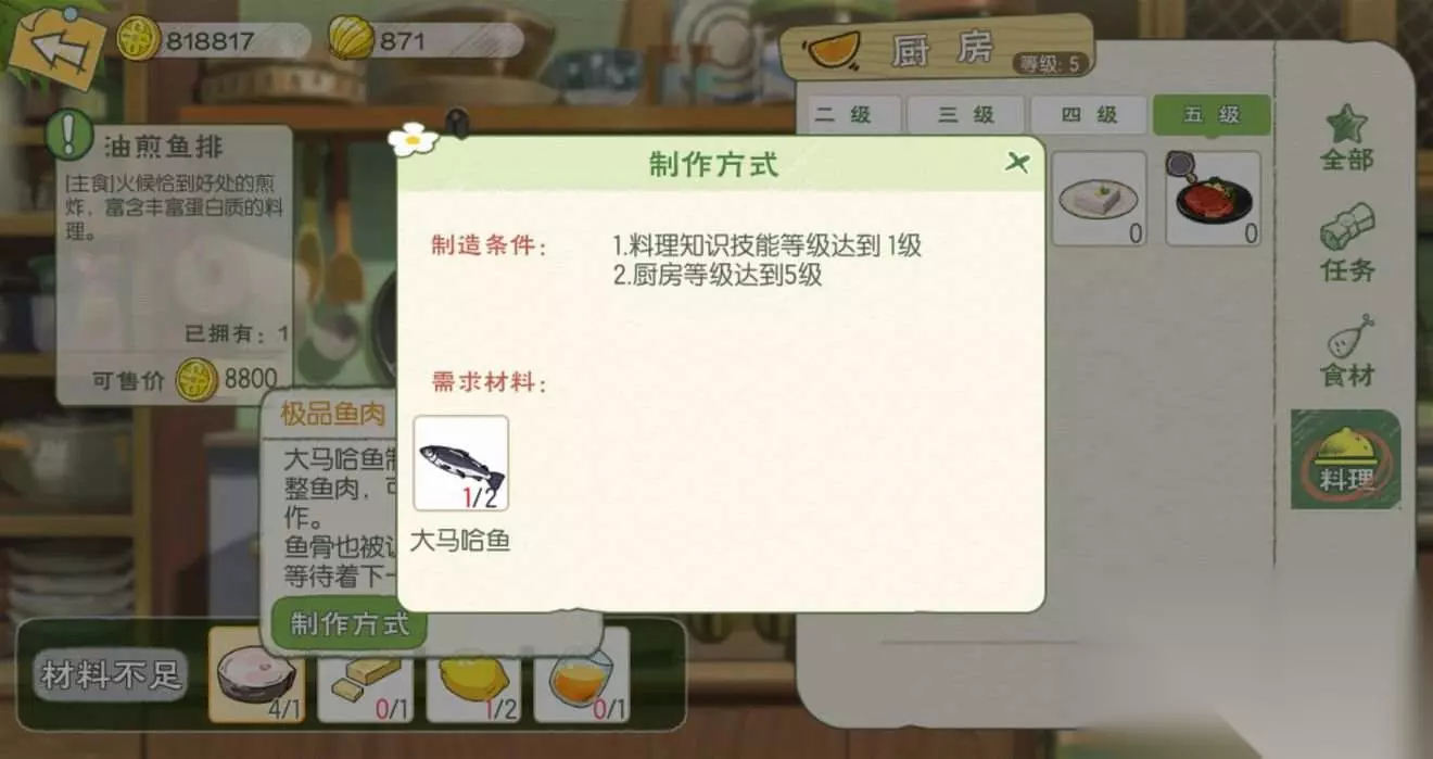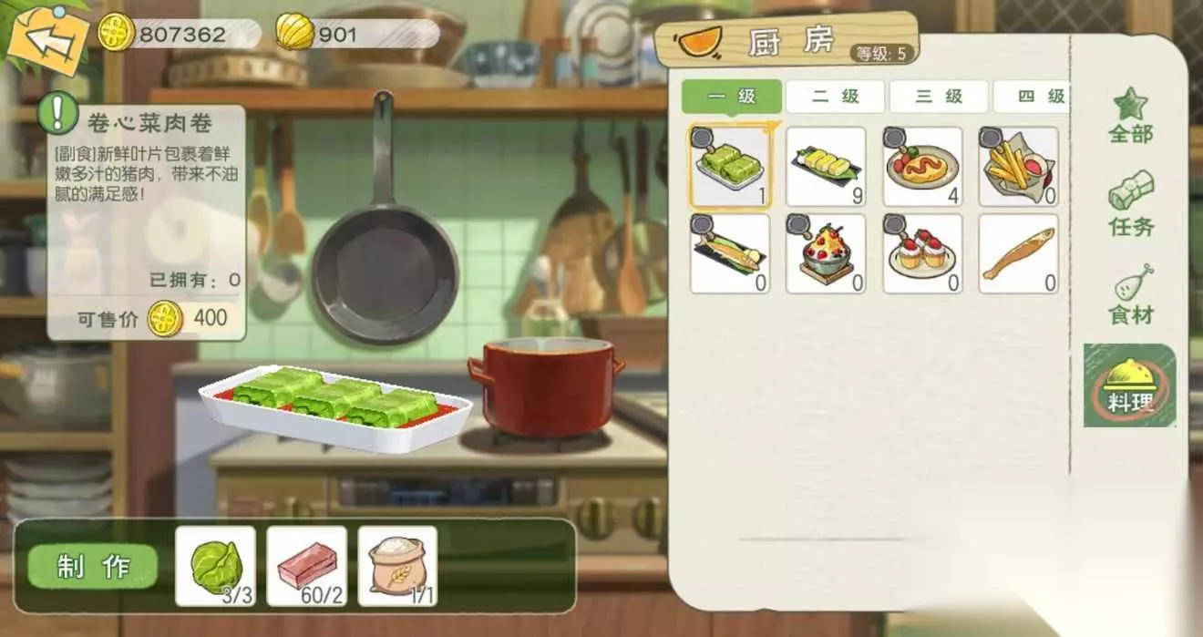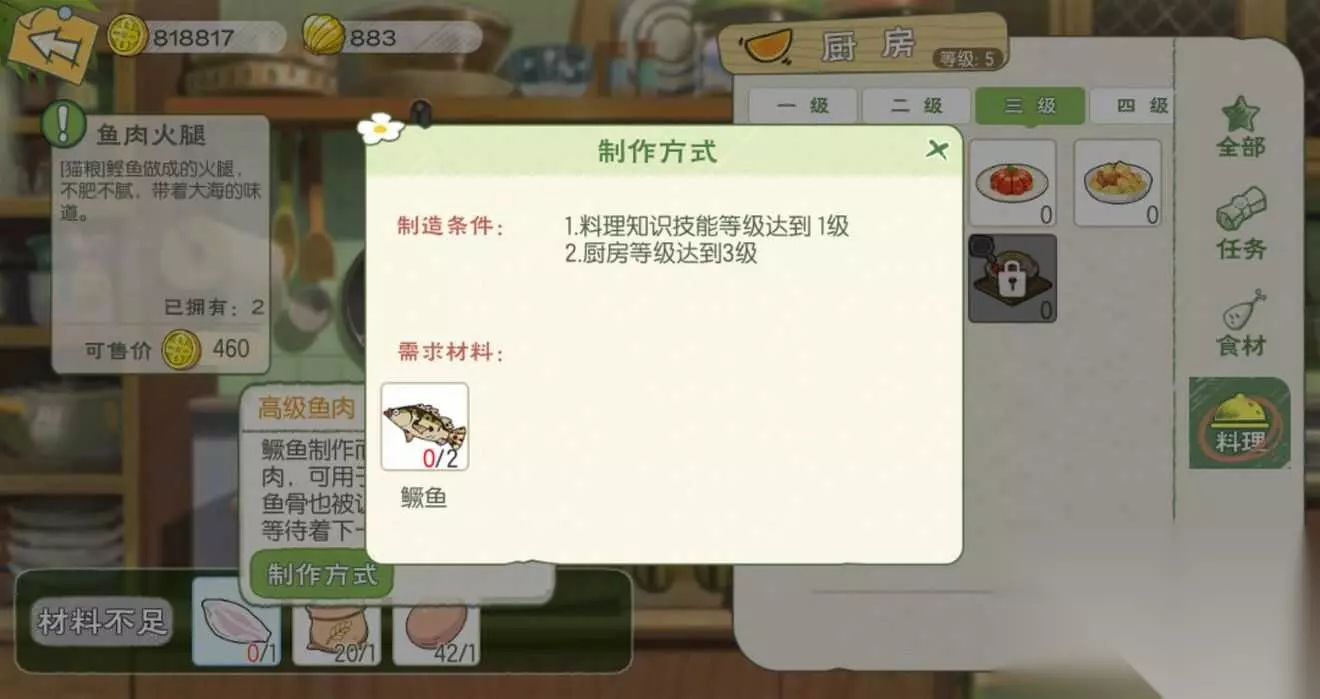 t15_2-t15_1:6.0 标签: 厨房 我们在游戏中可以化身厨神小当家,亲手制作各种美味的料理,而不同等级的料理也是需要相应等级的厨房才可以制作,这里就给大家带来了小森生活料理大全,各级厨房菜谱的制作配方以及料理效果介绍。 【1级厨房】 薯条:食用可恢复40点体力,移速提升10%(持续10分钟);