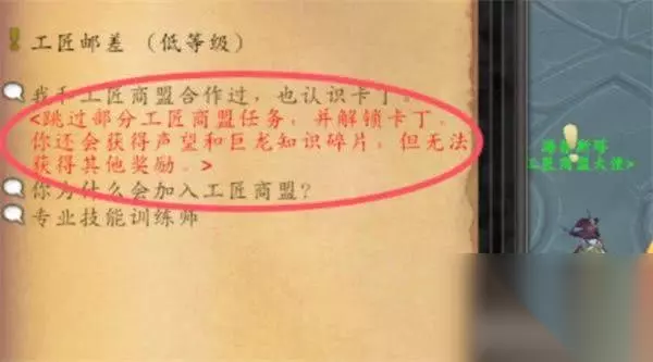 此处将提供选项“跳过部分工匠商盟任务链”,务必选择该项,以加快后续流程推进。
