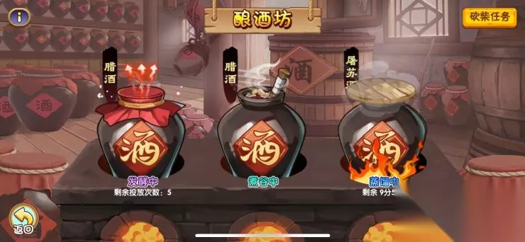 处于酿酒坊中,上仙需要对每一坛酒品进行 煮谷、发酵、蒸馏 三种操作,从而完成对酒品的酿造,掌柜已经为上仙们准备好了各种美酒的酿造方法,各位上仙仅需根据要求调配好谷物配比完成谷物烹煮,放入酒曲为酒品完成充分发酵,在蒸馏酒品中把握好火候,即可酿造出上好佳品~ 酿造完成后,即可获得酿造币奖励,前往江湖市集中兑换心仪好礼~