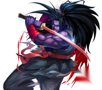 站位: 中敏 英雄定位:攻击型多倍伤害 必杀:飞到目标上方,对单体目标发动六次攻击,造成150%(攻击力)的伤害,10次连招 奥义:对目标单体发动连续攻击,造成150%(攻击力)的伤害,6次连招 普通:提升自己的命中 被动:如果敌方英雄闪避本方攻击时,立即对其发动一次不被闪避的攻击,产生200%的伤害。 牙神幻十郎:他邪魅狂狷,随心所欲,杀人无数,坠入鬼道。唯有一个执念——必须与霸王丸一决高下。