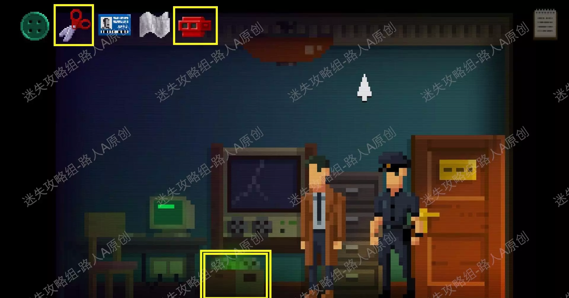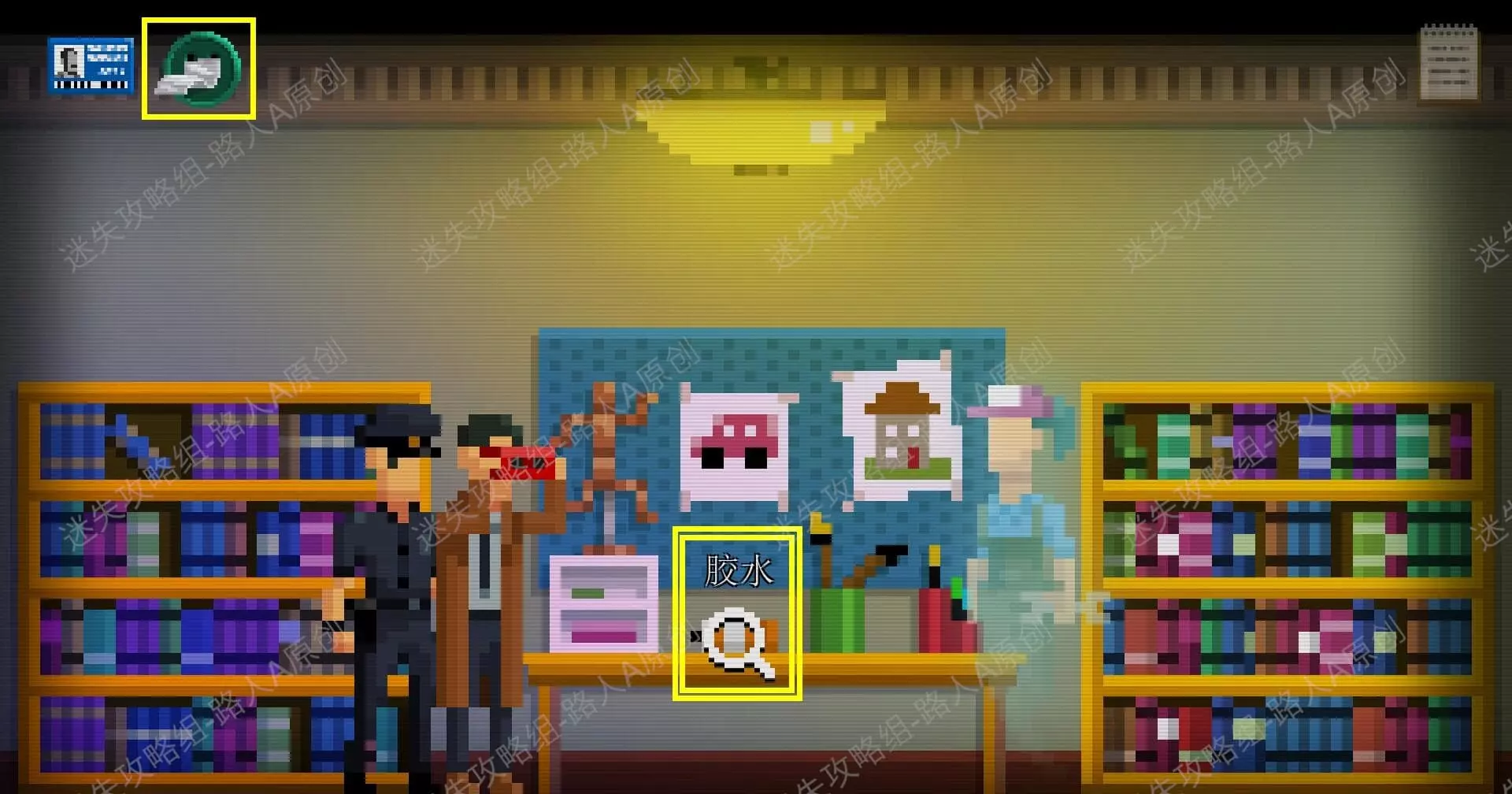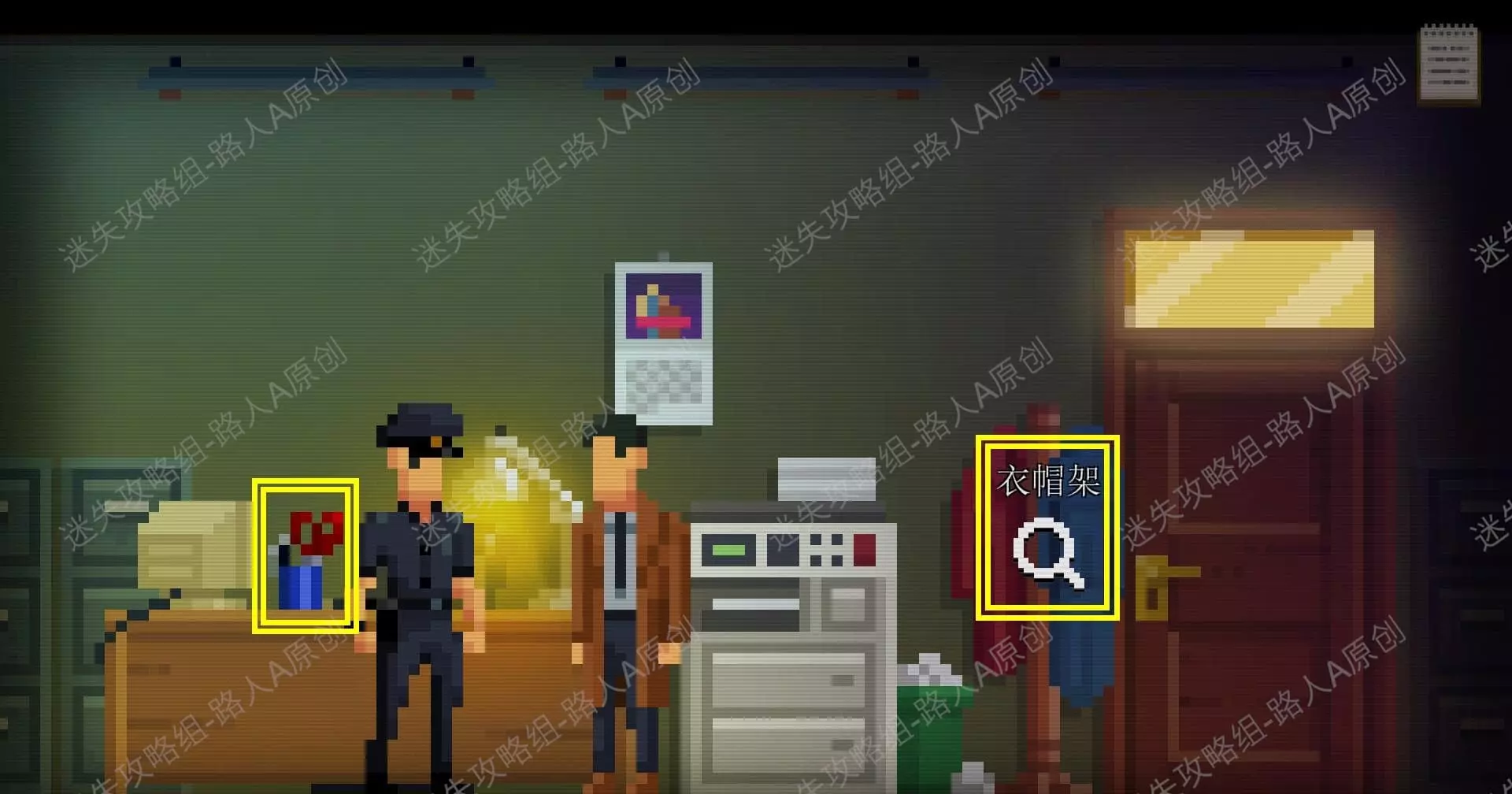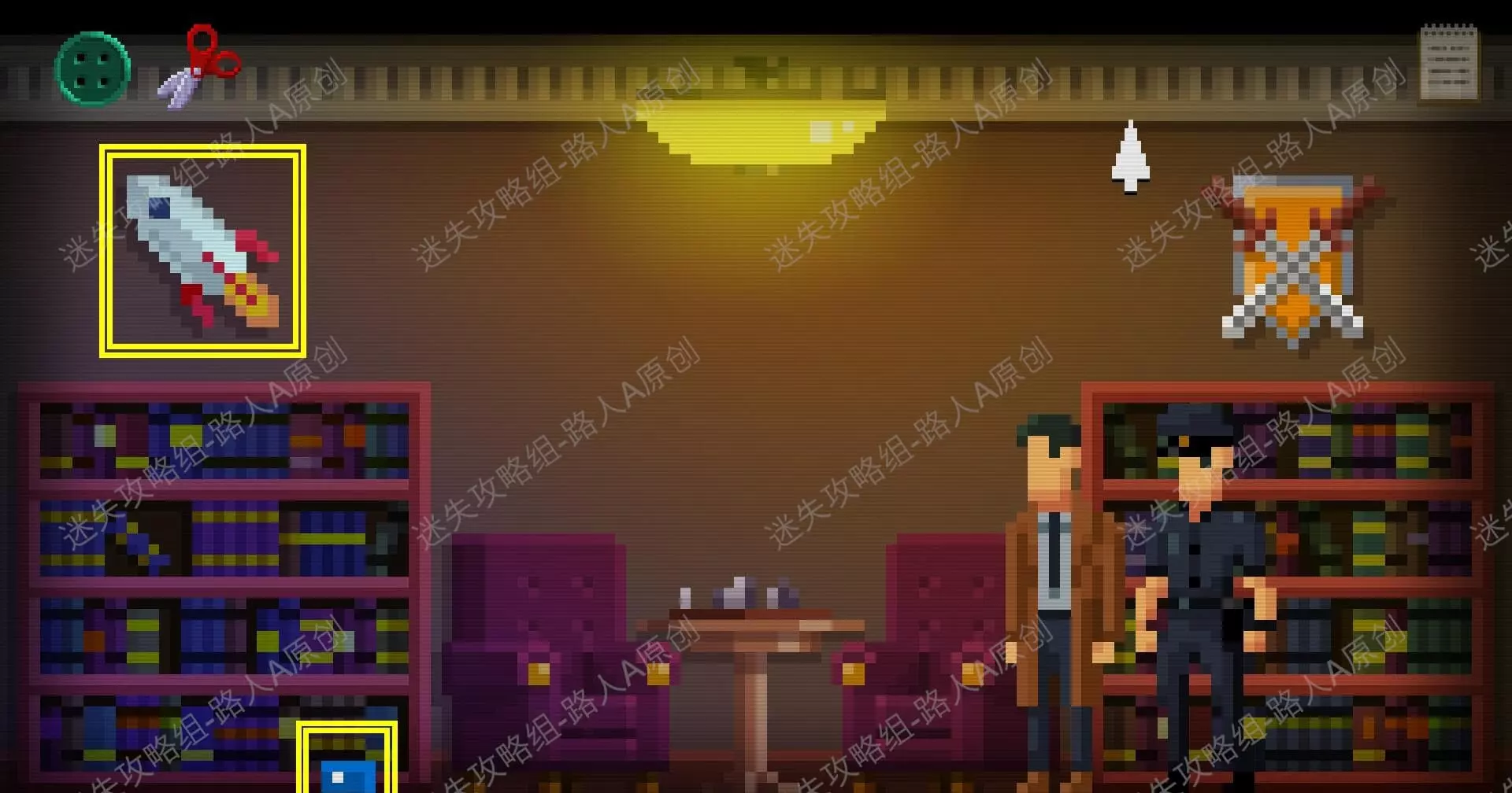 1.进入图书馆的办公室,调查衣帽架,获得【纽扣】。调查桌上的办公用品,获得【剪刀】。1.1