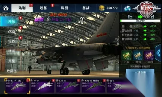 【战机升级】 升级是血战长空游戏里最基本的培养方式,随着主角色等级的提升,战机当然也不能落下(战机等级不能超过人物角色等级)。升级不仅仅是简单的等级提升那么简单,也是能够让你的战机能够获得属性的全面提升,包括战机的的强度、雷达制导、红外防御和雷达防御,保证你在副本双方交战中屹立不倒!升级需要消耗经验卡,经验卡分初中高三个等级,玩家完全可按自己的需求来。经验卡可在副本中获得,难度比较小。