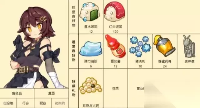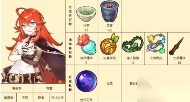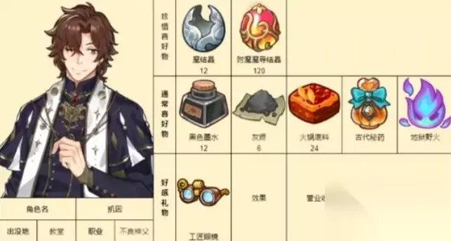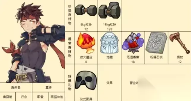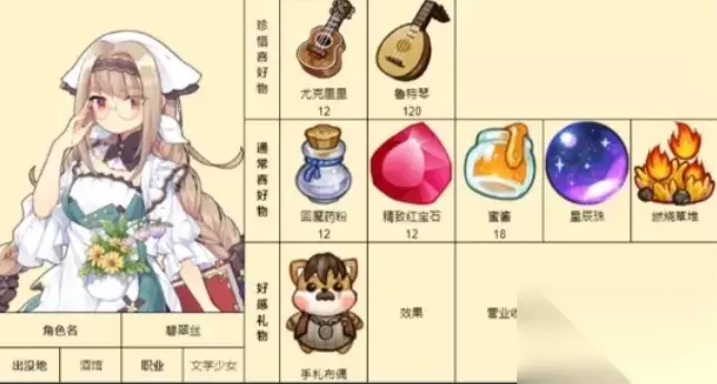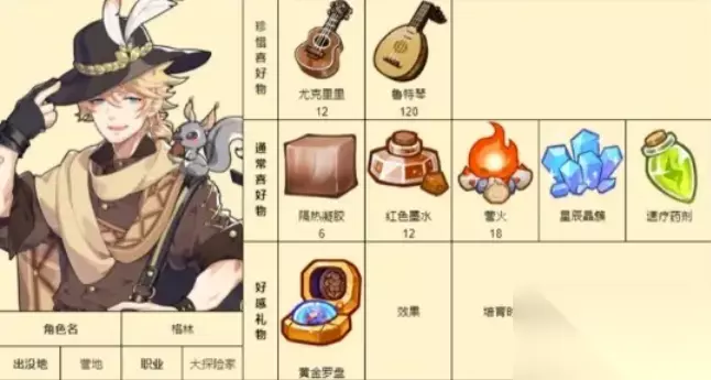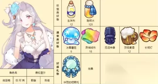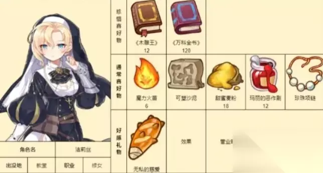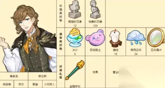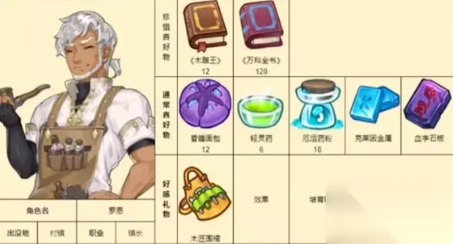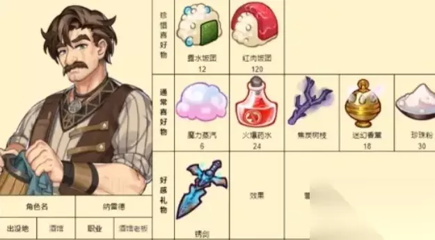 《诺弗兰物语》各个NPC都有喜爱的物品内容,赠送给NPC喜爱的礼物加成的好感数值也会更多一些。下面是具体的游戏中各个NPC的喜爱礼物详情攻略! 诺弗兰物语NPC好感度礼物攻略: 1、帕修姆:思苦、荆棘树冠;