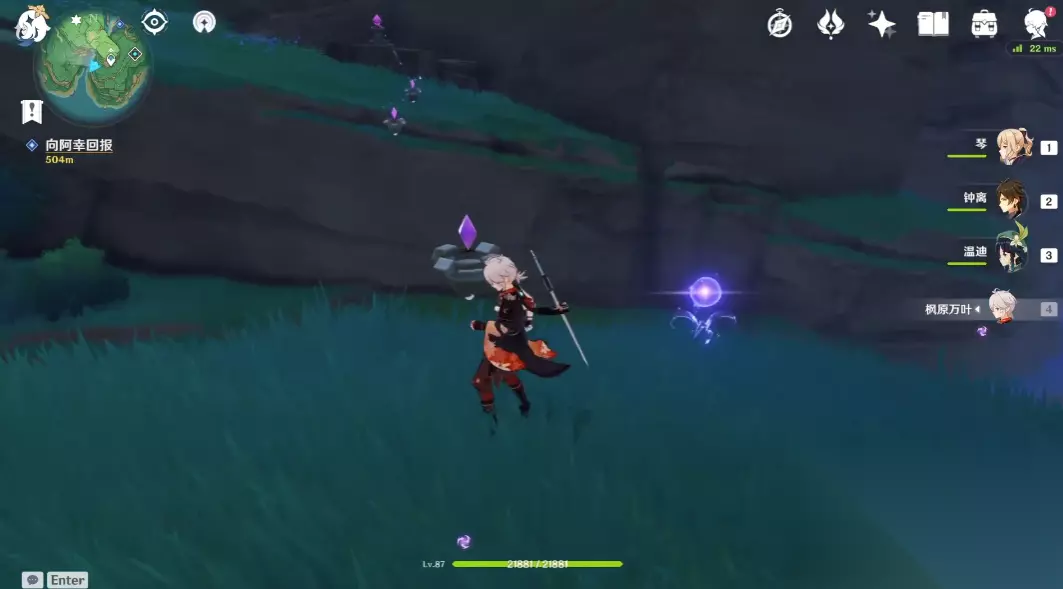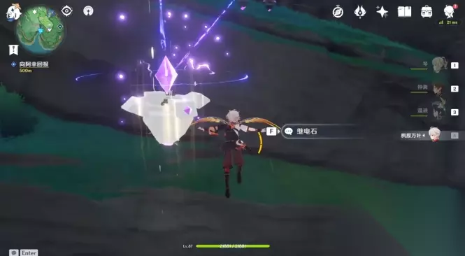 除了利用角色导电的方式外,其实这里还能用另外一种解密方式。滑翔的时候无法使用技能或者切换角色,但很多玩家会忽略一件事,那就是继电石其实是可以在空中放置的。所以拾取到多余的继电石之后,爬到上方的位置然后往悬崖中间的位置飞过去。在两者的正中间缓缓落到合适的位置,通过按钮放置继电石,这样也能让它们连接起来。两个继电石都能放在空中,只要相隔不远就算解密成功。