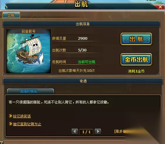 3、热血海贼王出航奇遇,在出航时会遇到类似上图所示的奇遇,选择相应答案有机会获得声望、阅历等。