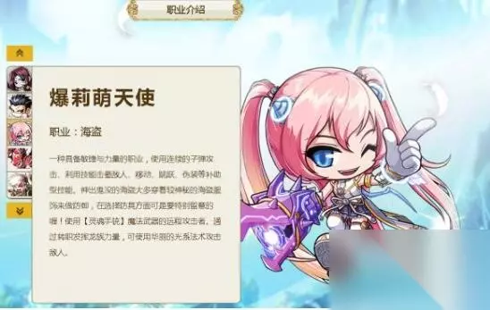 爆莉萌天使 职业:海盗 爆莉萌天使是一种具备敏捷与力量的职业,擅长使用连续的子弹攻击,利用技能击晕敌人,并具备移动、跳跃、伪装等补助型技能。神出鬼没的海盗大多穿着神秘的海盗服饰来进行防御,在选择防具时需要特别留意。他们使用灵魂手铳作为远程攻击武器。通过转职发挥龙族力量,可使用华丽的光系法术攻击敌人。