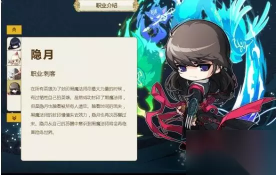 隐月 职业:刺客 隐月是一位英雄,为了封印黑魔法师而牺牲自己。虽然成功封印了黑魔法师,但隐月也随着被所有人遗忘。随着时间的流逝,黑魔法师的封印慢慢失去效力,隐月再次苏醒。从自己的苏醒中,隐月意识到黑魔法师将会再临冒险岛世界。