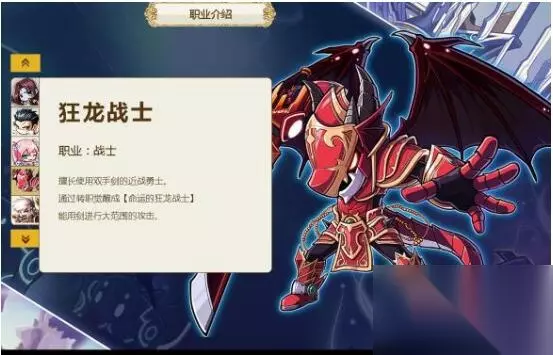狂龙战士 职业:战士 狂龙战士擅长使用双手剑进行近战攻击。通过转职觉醒成“命运的狂龙战士”,能够用剑进行大范围的攻击。