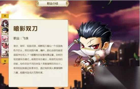 暗影双刀 职业:飞侠 暗影双刀是潜伏、破坏、双面间谍的角色,看似一个反面角色,却能挖掘内幕、爆料,甚至揭露金银岛教官里面存在的坏人! 具有颠覆性的背景故事设置,全新的双武器攻击模式,超高的攻击输出和绚丽而实用的技能,给你完全不同的体验!暗影双刀具备强悍的攻击力,使用短剑施展近距离攻击。通过转职深入掌握暗影力量,能够瞬间造成大范围伤害。