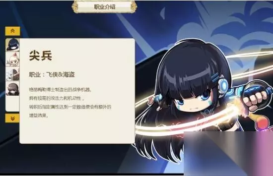 尖兵 职业:飞侠&海盗 尖兵是格丽梅勒博士制造出的战争机器,拥有较高的攻击力和机动性。转职后指定属性达到一定数值便会有额外的增益效果。
