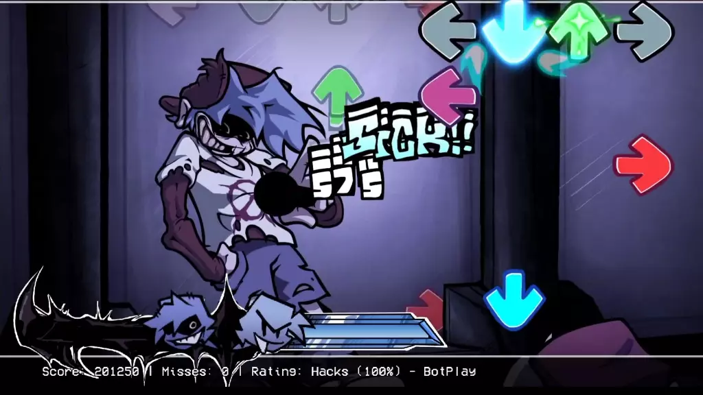 这是音游《周五夜放克》(FNF)的腐化模组游戏画面,展示了腐化岳父的对战场景,玩家需跟随箭头按键操作,画面中呈现了不同阶段的对战状态、得分与评级,充满暗黑紧张的游戏氛围。