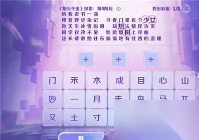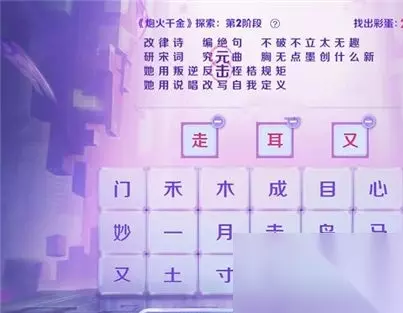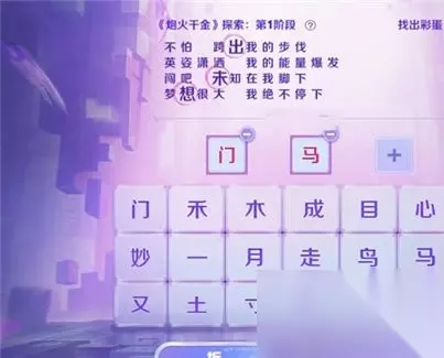 王者荣耀作为一款非常受欢迎的多人竞技策略游戏,游戏中设置了很多有趣的内容和玩法等着你体验,游戏每隔一段时间也会开启一些全新的活动,比如这次开启的炮火千金探索活动,那么这个活动的答案是什么呢?一起来了解一下吧。 王者荣耀炮火千金探索全部阶段答案汇总 音你闪耀-炮火千金: 1、活动的探索玩法主要是选字组合或者拆分成歌词当中的一个字。 2、探索活动中有4个阶段,每个阶段的答案是不同的,完成可以得到奖励。 如下: 第一阶段答案:出,闯,未,想