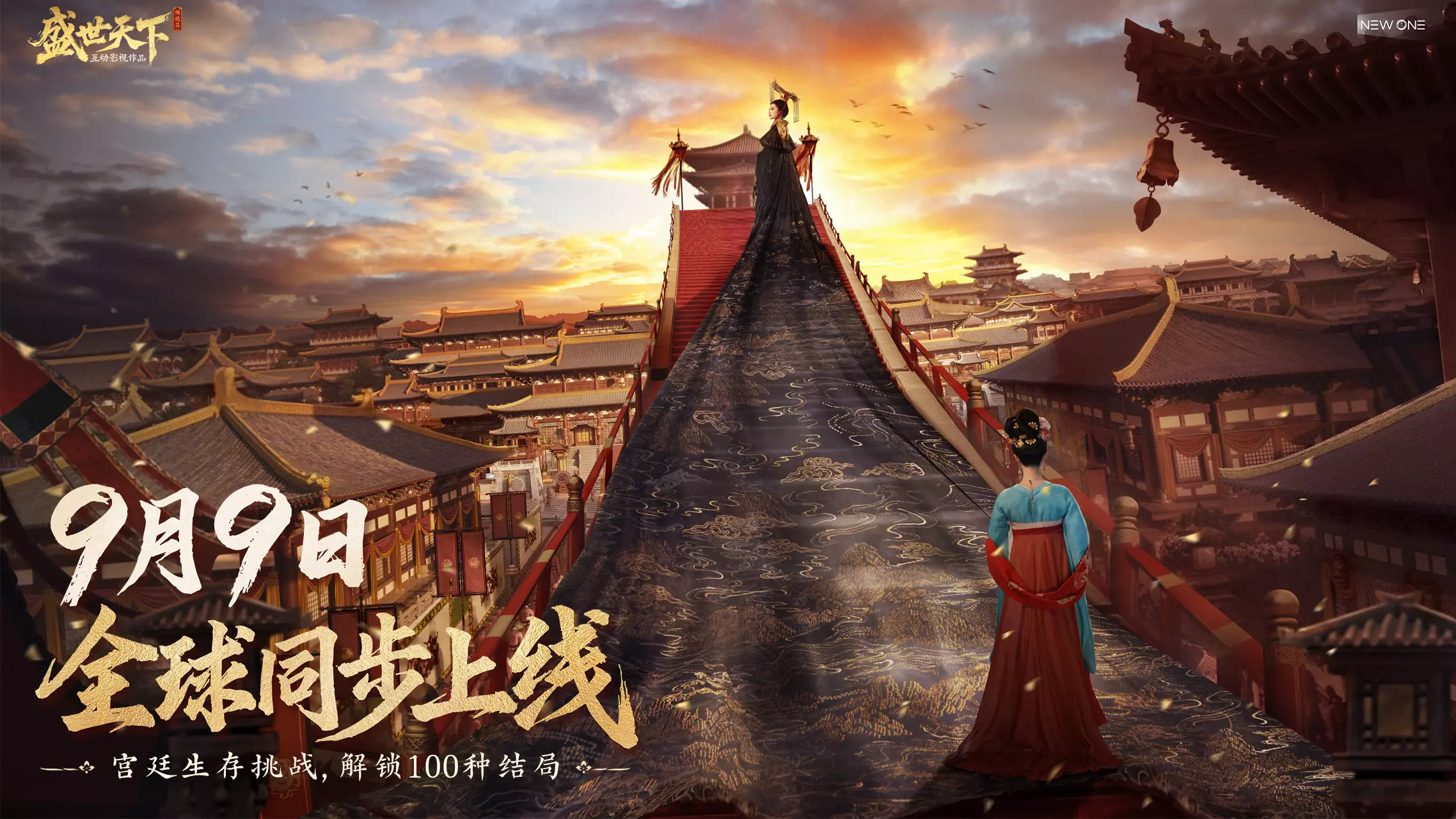 这是互动内容《盛世天下》媚娘篇的宣传,邀请用户开启重生体验,以成为女帝为核心主线任务,在充满凶险的宫廷中做出选择,亲自踏上女帝之路,完成执棋逆袭。