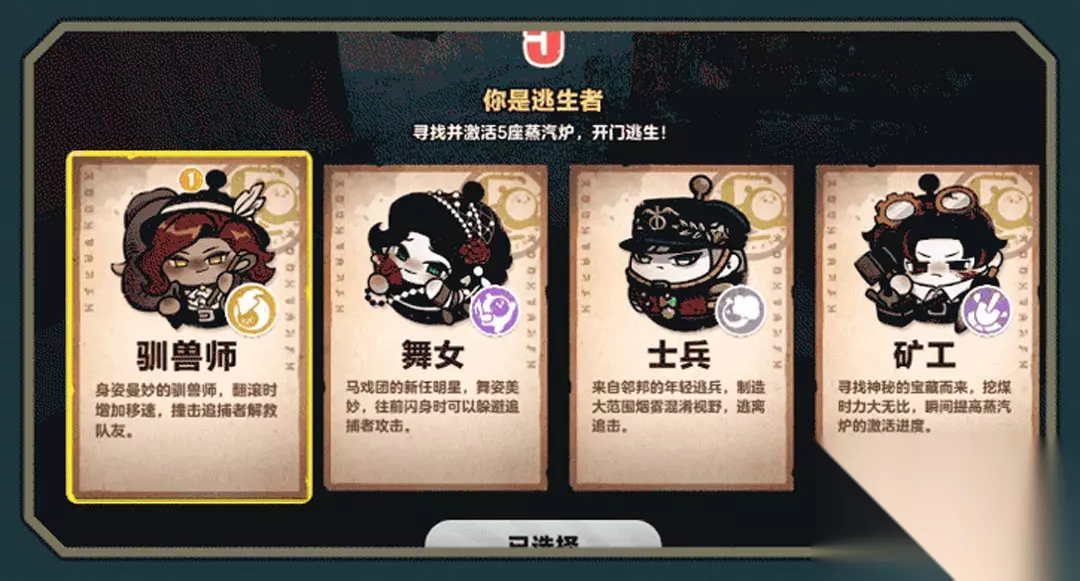 逃生者职业选择 游戏开局后,地图上全部7座蒸汽炉将在逃生者屏幕中高亮显示,蒸汽炉成功填充燃料则会向上喷出火焰。根据地图指引前往蒸汽炉,进行互动即可开始填充燃料。填充燃料的过程中有几率出现急需燃料的情况,当数值移动到红色或白色区域时,再次按下“挖煤”按键时,即可触发“完美的一铲”或“普通的一铲”效果,额外获得对应的燃料进度奖励。值得注意的是,若未在合适时机挖煤,逃生者会陷入短暂昏迷并中断挖煤状态,同时蒸汽炉会因为动力匮乏而回退一部分燃料进度。