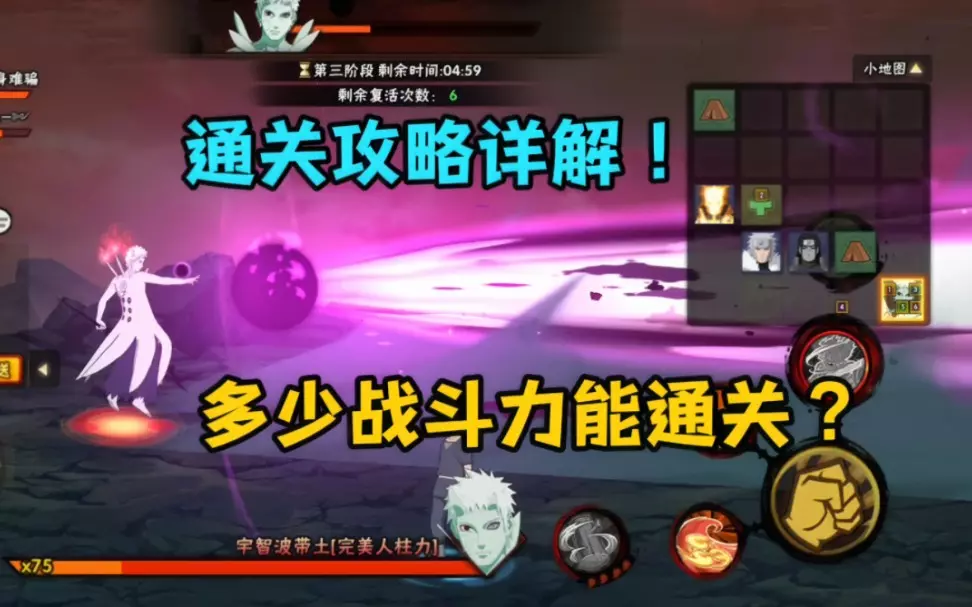 过完第二关会有个关卡动画,结束后就能正式挑战第三关。第三关要打的对手是金角和银角,打之前有个小技巧,能有限攻打左边的阿斯玛,打完它们的查克拉就会被压制,等查克拉压到0的时候再去打会更加容易。金角银角有个机制,就是它们必须要在短时间内同时打死,不然另一个就会把死掉的角色复活起来,这样就很难通关了。玩家要做的就是一起压低血量,等都只剩最后一点血的时候再使用奥义忍术打一波爆发全部带走。
