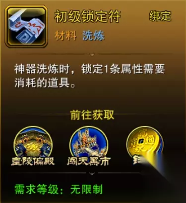 在通常情况下光有洗练石是不够的,锁定符也是一件十分重要的东西有了锁定符就可以在洗练石锁定一条你不希望改变的属性,这样玩家们就可以保护自己心爱的属性不会被一起洗练掉了,怎么样?是不是很方便?在这里提醒一下诸位玩家们锁定一条属性只需要初级锁定符,而在一次洗练操作当中同时锁定两条属性的话则需要中级锁定符。同理锁定三条属性的话需要高级锁定符,在一次洗练操作当中只能同时够锁定三条属性。