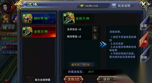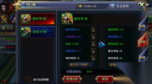 与炼星玩法相同,神器的洗练操作同样通过神器面板当中完成,玩家们可以锁定自己不希望改变的属性,进行洗练操作之后如果不合心意的话也可以选择不保存。要记住:只有进行过保存操作之后重新洗练出的属性才算生效。