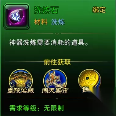 在洗练当中玩家们首先需要的是洗练石,洗练石可以通过皇陵偏殿副本活动、闯天黑市、以及钱庄当中获得,洗练石没有品质限制,任何洗练石都可以对任何品质的神器进行洗练哦!