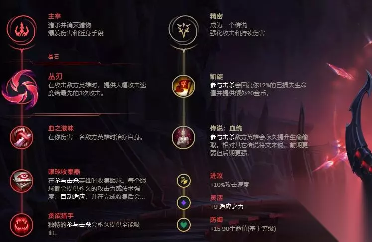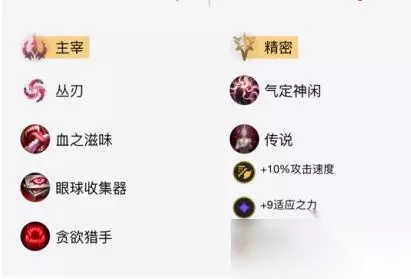 装备分析:这套装备可以让卡莎的输出非常爆炸,而且可以顺利的保证卡莎的三个技能的进化,轻松的打出超高的爆发输出。 2、卡莎无限火力天赋符文: (1)主系符文:主宰+丛刃+血之滋味+眼球收集器+贪欲猎手; (2)副系符文:精密+凯旋+传说血统;