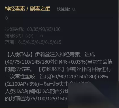 技能介绍 1、蜘蛛的技能主Q副W,Q技能是对敌人造成魔法伤害,人类形态和蜘蛛形态的伤害算法不同。