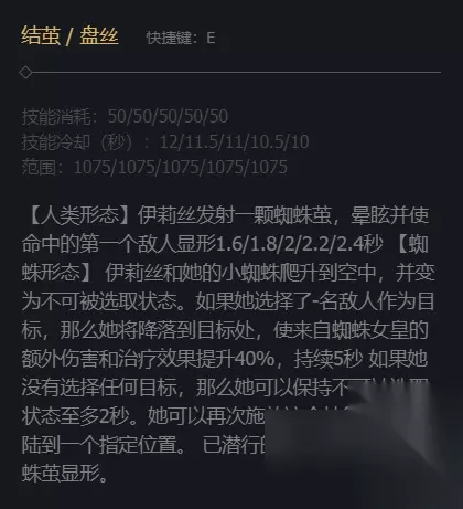 3、E技能人类形态时时眩晕一名敌人并使其显形;蜘蛛形态时是自己变为不可选状态,如果选中了一名敌人,则会降落的敌人处造成大量伤害并提升治疗效果,不可选状态最多持续2秒。