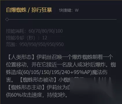 2、W技能在人类形态时召唤一个爆炸蜘蛛,爆炸蜘蛛会在接近敌人或者5秒后爆炸;蜘蛛形态时,W的被动是小蜘蛛获得攻速加成,主动是为自己和小蜘蛛大幅提升攻速。