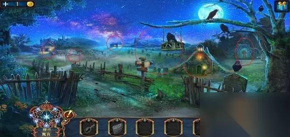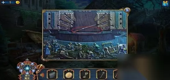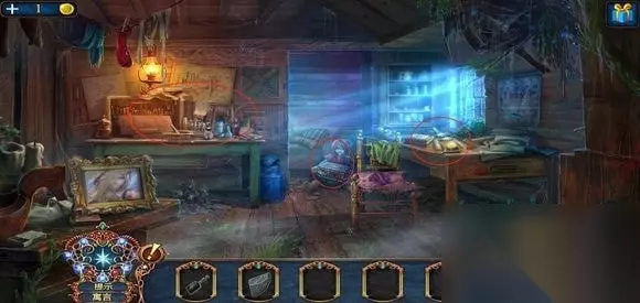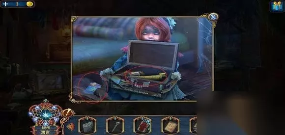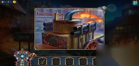 进入房子,右边壁炉捡起火的符号,用铲子铲灰,捡起框饰。左边地上,捡起火柴盒,小人。出门,在水车上用“火”打开柜子,得到凤凰装饰。