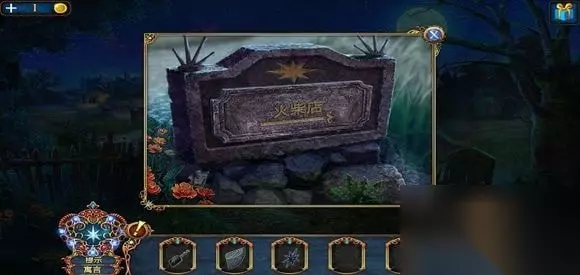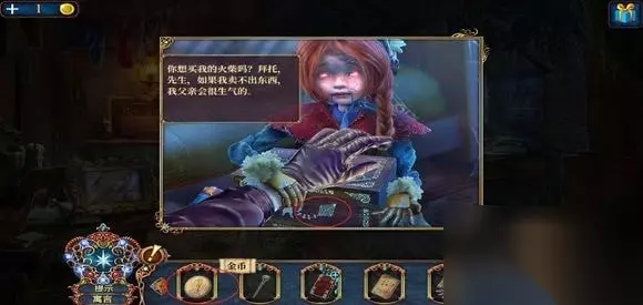 进入火柴店,点右边的桌子,打开盒子,得到火柴店标志。