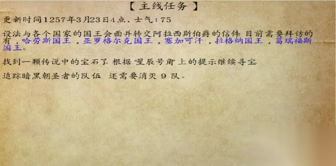 骑马与砍杀:火与剑光明与黑暗任务流程大致跟着剧情走最后消灭拉格纳国王。具体如下: 1、首先在奴隶贩子拉蒙的帮助下找到嬷嬷茶,击杀10队水贼让任务完成度达到P,然后找酒馆老板苏克,触发暗黑朝圣者任务,击杀暗黑朝圣者拯救雅米拉,获得神秘山谷 。如下图两所示: