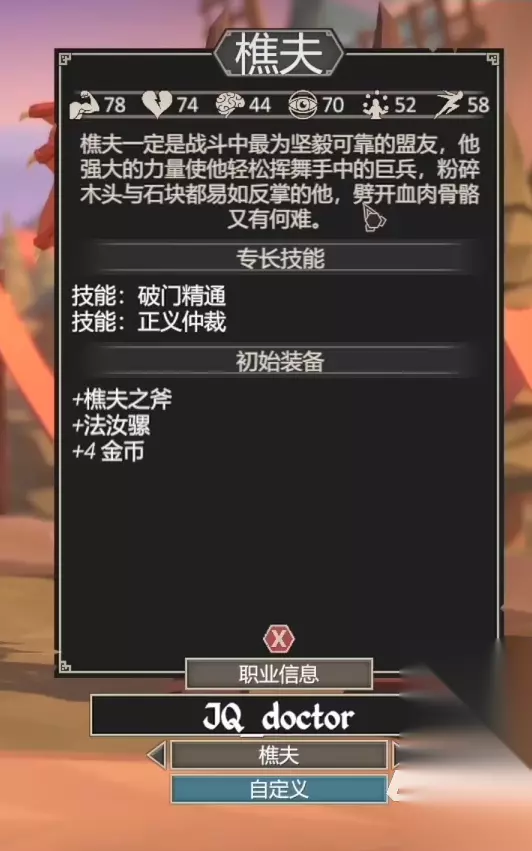 装备方面,初始装备是破碎的琵琶以及一个开锁器和两个金币。武器还算可以,能一定程度增加前期的金币获取,开锁器一个的话勉强够用。总结起来,该角色可以成为一个防御辅助,配合其技能纷扰之音,干扰敌人行动打持久战和长线作战都非常不错。 2、樵夫 樵夫是一个半肉半输出的代表性角色,玩任意一局模式后,花费18点学时点数解锁。在一众角色当中,力量基础是最高的,甚至比角斗士和铁匠还要高上两点。且生命值也很不错。不过速度方面会有点慢,意识的话还算可以,属于一个偏输出类型的角色。