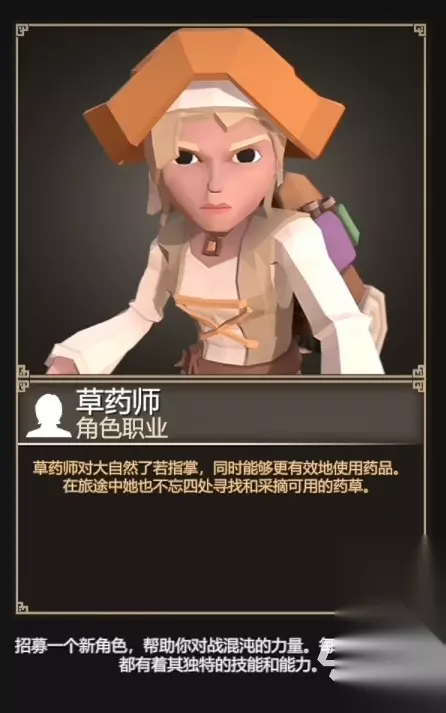 初始自带物品方面,一个樵夫斧一个法汝骡以及四个金币。斧子还算可以,在前期用用勉强够格。法汝骡的话,则是一个可以提升战斗伤害25%的加成道具。总的来说,该角色的伤害手段较为丰富,加上双手武器斧子的加成以及溅射伤害,能打出很不错的输出效果。再配上一定的坦度道具,那么可以当做团队中的主力位置使用。 3、草药师 该角色是属于一个智力类型的角色分类,玩第一局任意模式后,需要消耗15点学识点数可以解锁。其基础属性方面,在智力系角色当中属于顶尖水平,意识非常优秀,而且速度也很不错,不过其他属性方面就比较弱了,适合作为团队中的辅助或者法术输出来游玩。