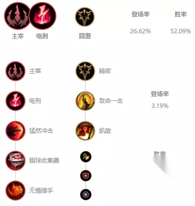 推荐:主宰+精密(电刑) 推荐思路:蔚带电刑可以在前期大出更高的伤害,且猛然冲击可以配合蔚的位移可以增加物法双穿,致命一击可以让蔚对血量低的敌人打出额外伤害。