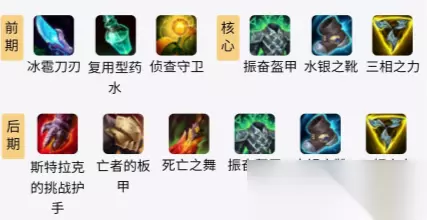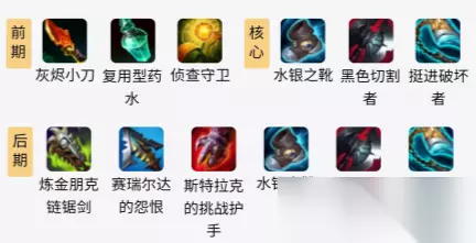 lols11蔚出装推荐 小编推荐: 一、输出AD通用出装 1.初始装备:灰烬小刀+复用型药水+侦查守卫 2.核心装备:水银之靴+黑色切割者+挺进破坏者 3.后期装备:炼金朋克链锯剑+赛瑞尔达的怨恨+斯特拉克的挑战护手+水银之靴+黑色切割者+挺进破坏者(神话)