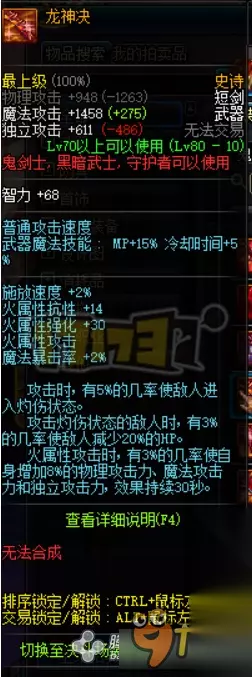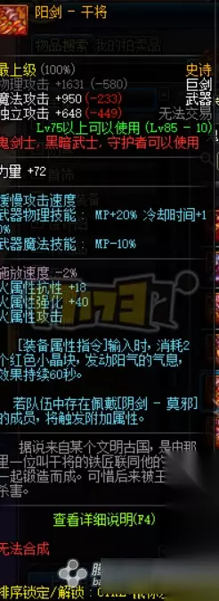阳剑-干将 85级史诗巨剑,面板较高。单独使用就只有火强的增加不少很实用,如果搭配阴剑效果就好多了,然而实战中很难总是能搭配到阴剑玩家,总统来说不推荐使用。